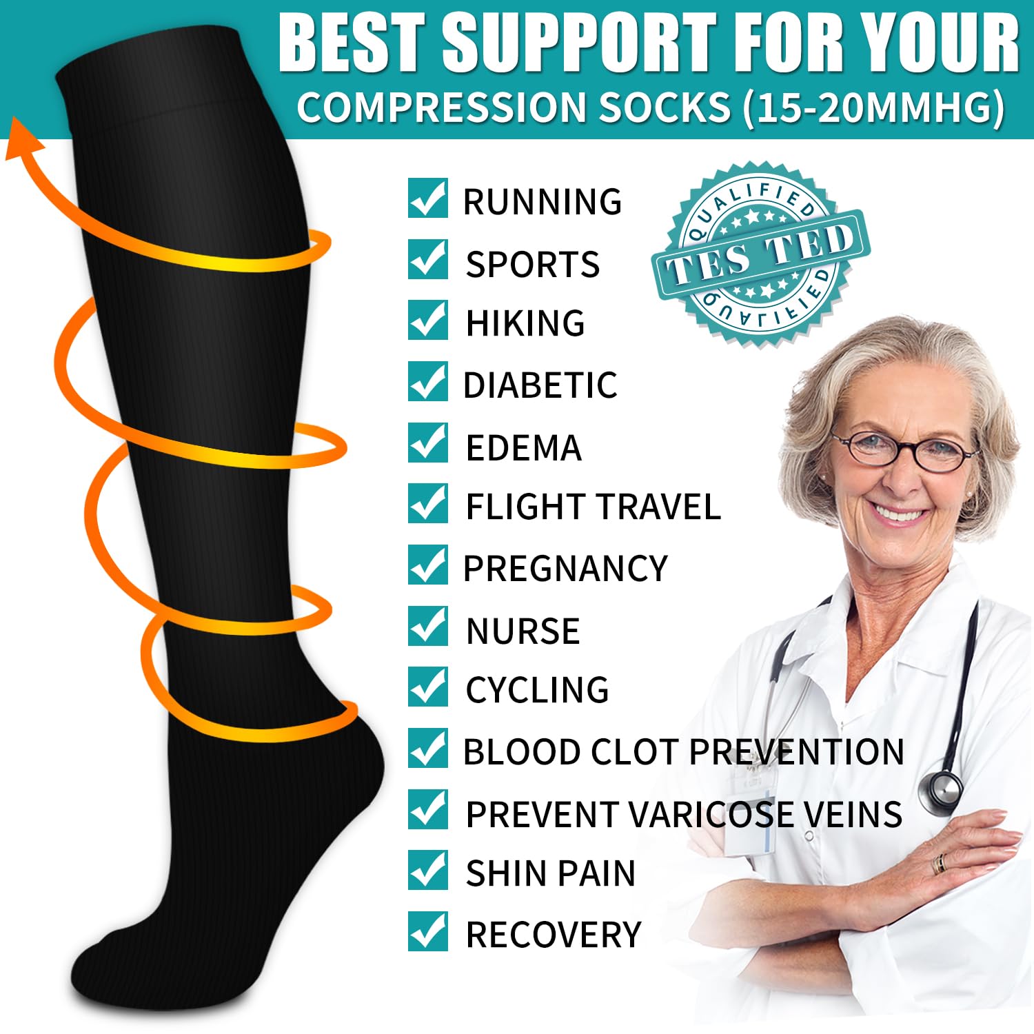 - VALUE PACK - Each pack includes 6 pairs of compression socks. Our design of comfort and style comes at a very affordable price in comparison. There are available in different fabrics and colors. They are discreet and look like the ordinary socks you have already wear to work. Our socks are universally suitable for all work.Whether you are an athlete,teacher,flight crew,receptionist, office worker, pregnant, elderly ,they'll work for you as you work for yourself and your family.